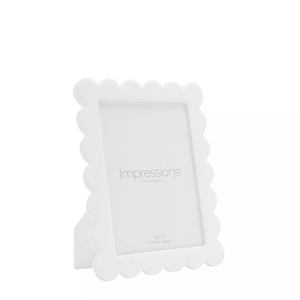 The Impressions Acrylic and Epoxy Photo Frame Flower Shaped Edge in white features a unique scalloped design to showcase 5" x 7" photos beautifully. This playful frame with a white finish complements any décor, adding a hint of fun to any mantelpiece, shelf, or desk.