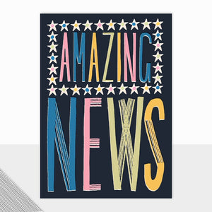Caption: Amazing News Card size when packed: 125 x 175mm The Fontfetti Collection. Our latest typography range featuring modern captions combined, striking colour-ways & a deep emboss. This contemporary collection is perfect for all age groups, and comes complete with a black & white striped envelope. This particular design features the caption 'Amazing News'.