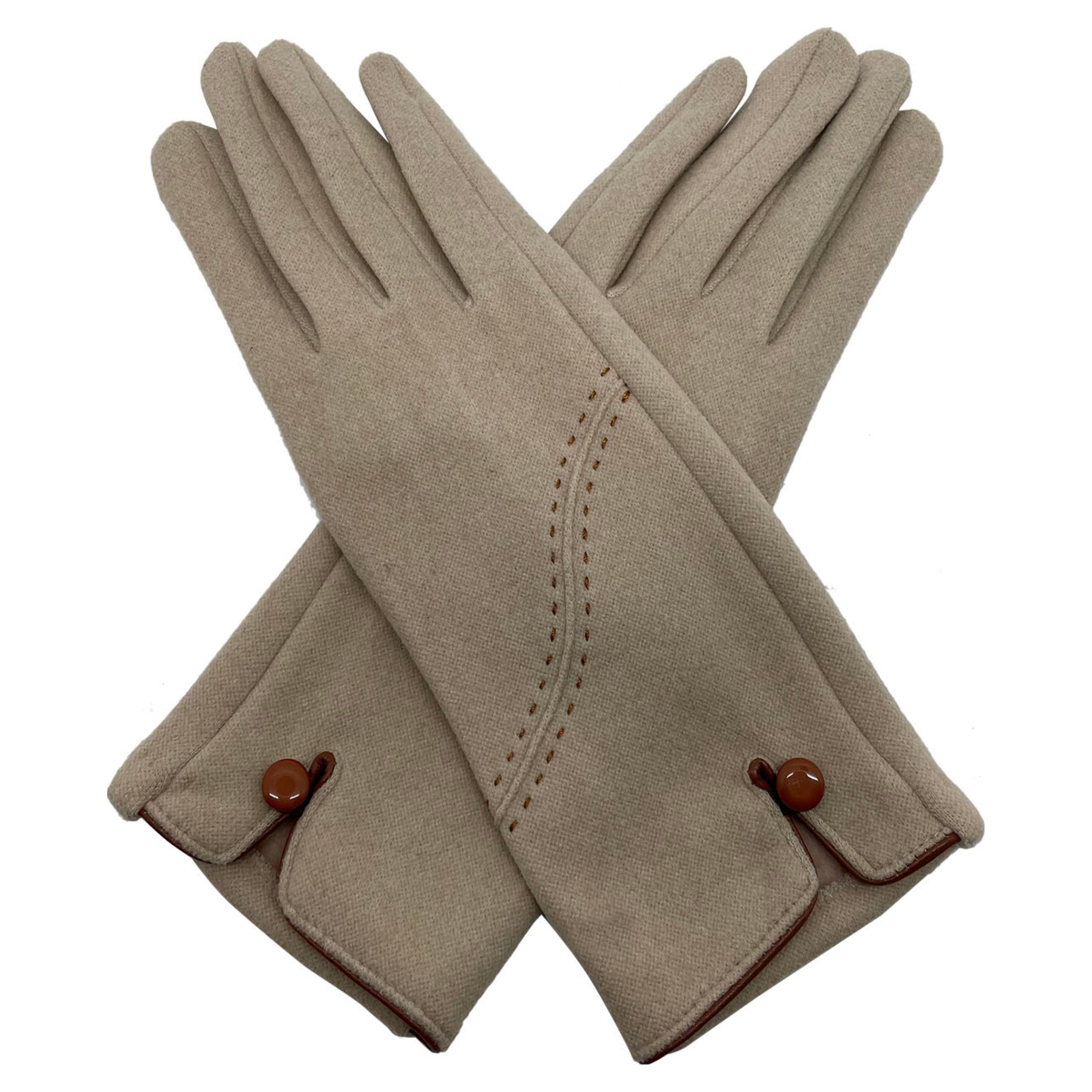 Thermal Felt Beige Gloves with Stitch & Button Detail