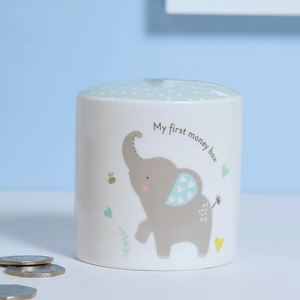 The Hello Baby Money Box – Boy is a charming keepsake designed to celebrate a new arrival and start saving for the future. Made from white ceramic, it features a sweet blue and grey elephant design with "My first money box" printed on the front. Ideal for storing coins and cash gifts from parents, grandparents, or friends.