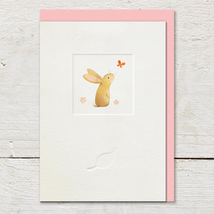 Card featuring an illustration of a cute little rabbit watching a butterfly, in the middle of a small debossed window panel. Card is left blank for an open send.