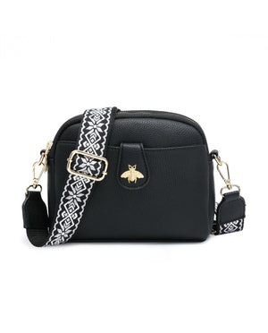 Cross Body Handbag with double zip top sections, front pocket and bee badge with adjustable wide strap .