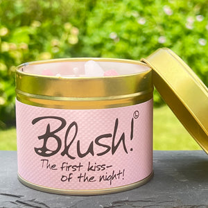 Hand poured into a gold tin and finished with a blush pink paper sticker titled 'Blush! The first kiss - of the night' in elegant text.