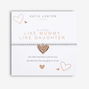 A rose gold heart charm hangs from this round silver bead bracelet. This children's bracelet is perfectly presented on a decorated card with the title ‘Like Mummy Like Daughter’. The sentiment ‘this little bracelet is just for you like mummy like daughter it's true!’ is printed on the bottom of the card.