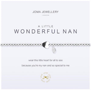 A silver heart charm hangs between round silver beads; the bracelet is perfectly presented on a branded card with the title ‘Wonderful Nan’ in black text and the sentiment ‘wear this little heart for all to see because you're my nan and so special to me’. A gorgeous little gift for the most wonderful nan.