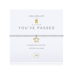 A gold star charm hangs between round silver beads; the bracelet is perfectly presented on a branded card with the title ‘You've Passed’ in black text and the sentiment ‘this golden star is just to say well done to you today’. A gorgeous little gift.