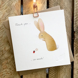Card featuring a cute rabbit looking at a ladybird holding a small flower. Caption reads "Thank you...so much!"
