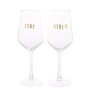 • Set of two matching wine glasses with 'Mr' and 'Mrs' in stylish gold lettering