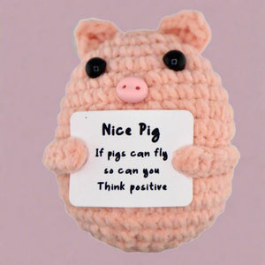 This cheerful crochet pig clutching a motivational sign is sure to brighten any space. Made with care, it adds a playful touch and spreads positive vibes wherever it goes. Perfect as a gift or a cute decoration to lift your mood!