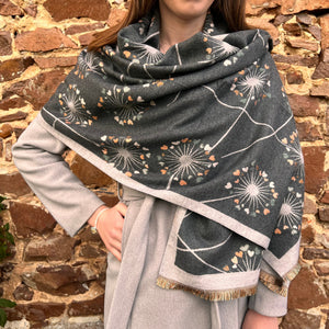This luxuriously soft, medium weight reversible scarf features stylish dandelion clocks with tiny hearts in a beautiful combination of colours. Wear as a scarf round the neck or a wrap around the shoulders. It coordinates well with so many outfits, you'll find you can throw it on for extra warmth and effortless style anytime. Makes a perfect gift.