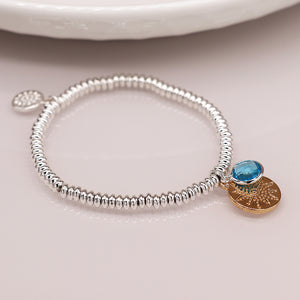 Silver plated bead bracelet with a faux gold plated embossed disc charm and a faceted aqua crystal