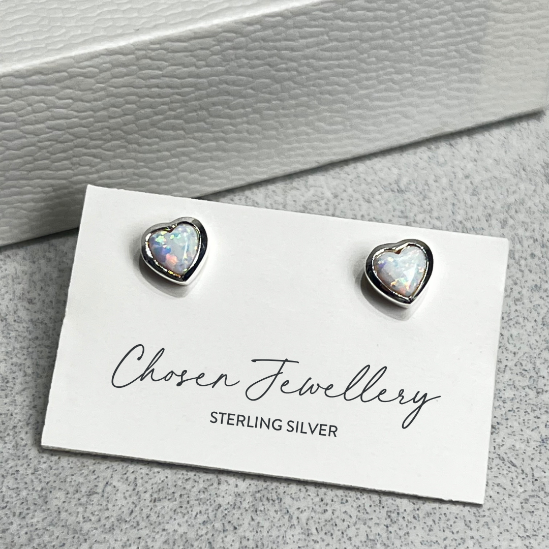 Sterling silver heart shaped stud earrings inset with synthetic white opal centres